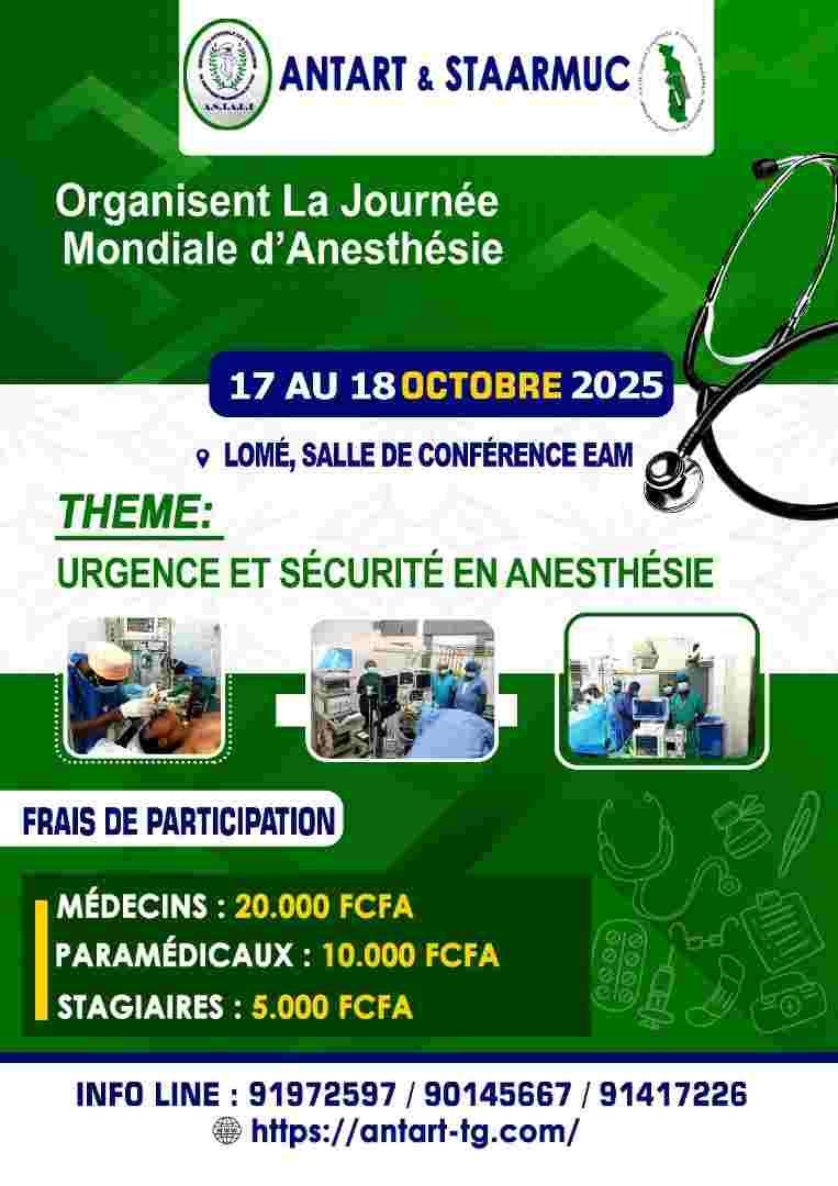 En marge de la Journée Mondiale de l'Anesthésie (célébrée internationalement le 16 octobre), l'Association Nationale des Techniciens d'Anesthésie et de Réanimation du Togo (ANTART) organise deux jours de rencontres professionnelles majeures. L'événement prendra place à l'École des Auxiliaires Médicaux (EAM) du CHU Sylvanus Olympio et réunira les experts nationaux de la spécialité.